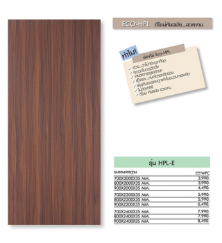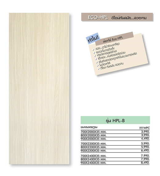 นวัตกรรมใหม่ของบานประตู เพิ่มความสวยงาม โดยใช้วัสดุปิดผิว ด้วยแผ่น HPL (High Pressure Laminate) มีลวดลายและสีสันให้เลือกหลากหลาย สามารถผสมผสานลวดลายได้ตามต้องการ อีกทั้งยัง ดีไซน์เส้นเซาะร่อง ได้ทุกรูปแบบ ตอบสนองทุกจินตนาการ ทนทานต่อปลวก มอด และแมลงต่างๆ โดยการพัฒนาโครงประตูที่ใช้ไม้ SYP ซึ่งมีคุณสมบัติกันปลวกได้โดยธรรมชาติ โดยไม่ต้องเคลือบน้ำยาเคมีใดๆ ปลอดภัยต่อคุณและโลก
