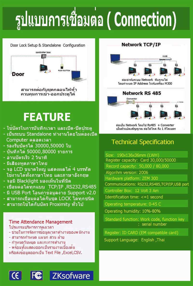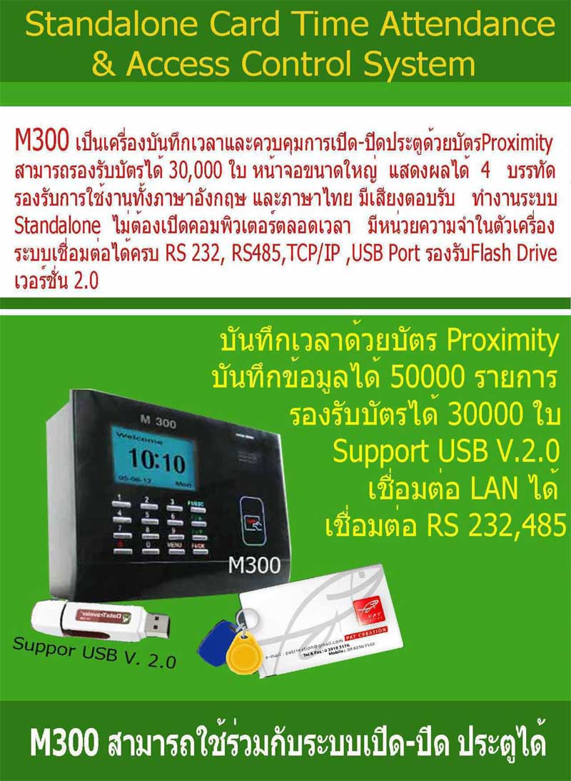 ZK M300 เครื่องทาบบัตร คีย์การ์ด บันทึกเวลาทำงานด้วยบัตรคีย์การ์ด ด้วยรูปลักษณ์ที่ทันสมัย และหน้าจอขนาดใหญ่ แสดงผลได้ถึง 4 บรรทัด รองรับเมนูการทำงานทั้ง ภาษาไทยและภาษาอังกฤษ เสียงตอบรับสถานะการทำงานเมื่อทำการบันทึกเสร็จสมบูรณ์ ทำงานได้ทั้งในระบบ Standalon ไม่ต้องเปิดคอมพิวเตอร์ตลอดเวลา ลดปัญหาการสิ้ินเปลืองไฟ รองรับบัตรคีย์การ์ดได้ 30,000ใบ รองรับการบันทึกเวลาได้ 50,000รายการ มีหน่วยความจำในตัวกรณีไฟดับ ข้อมูลไม่สูญหาย อ่านบัตรคีย์การ์ดได้รวดเร็วภายใน 2 วินาที เชื่อมต่อเพื่อดึงข้อมูลได้ทั้ง Network(TCP/IP), RS232, RS485, USB Flash Drive มีโปรแกรมบริหารจัดการเวลา Time Attendance Management ทีมาพร้อมกับตัวเครื่อง ช่วยในการจัดการข้อมูลเวลาของพนักงานได้เป็นอย่างดี
